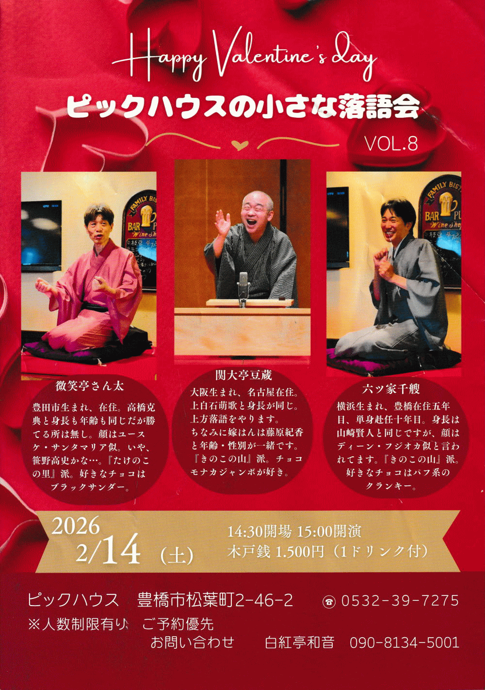 ピックハウスの小さな落語会2月14日(土)午後3時~出演:関大亭豆藏・六ツ家千艘・微笑亭さん太:木戸銭1500円(ワンドリンク付):ピックハウス(豊橋市松葉町2丁目)0532-39-7275