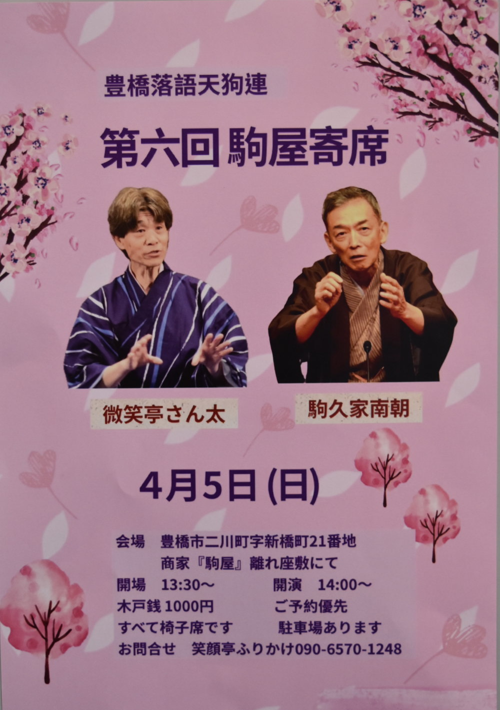 第6回駒屋寄席4月5日(日)午後2時~出演:微笑亭さん太・駒久家南朝:木戸銭1000円:商家「駒屋」豊橋市二川町字新橋町21:問合せ・笑顔亭ふりかけ090-6570-1248
